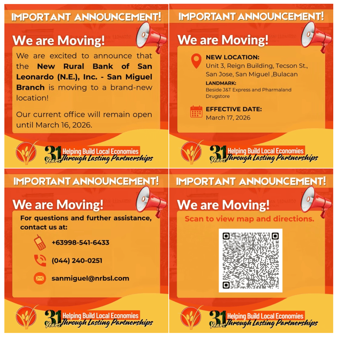 The New Rural Bank of San Leonardo (N.E.), Inc. is pleased to share that our San Miguel Branch has officially transferred to its new location at Unit 3, Reign Building, Tecson St., San Jose, San Miguel, Bulacan as of March 17, 2026.